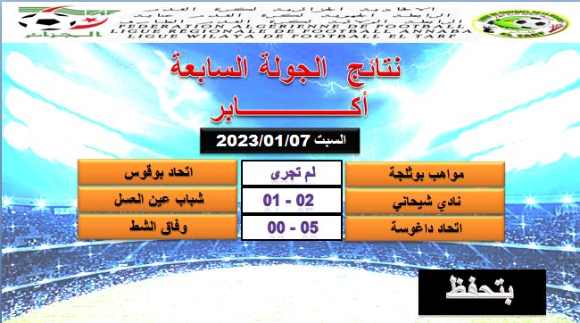 نتائج الجولة السابعة صنف أكابر ليوم السبت 2023/01/07 ACTUALITES RESULTAT 7 janvier 2023 تحميل Share on Facebook Share Share on TwitterTweet Share on Google Plus Share Share on Pinterest Share Share on LinkedIn Share Share on Digg Share