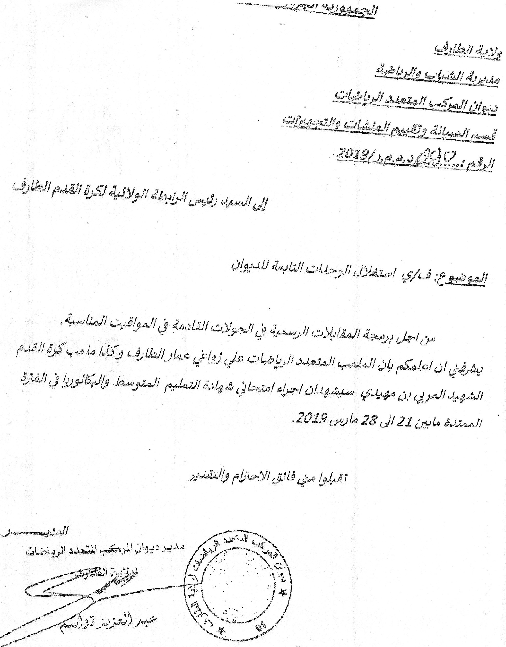 توضيح ACTUALITES Compétitions 1 avril 2019 الاسباب التي دفعت الرابطة لتأجيل الجولة ال 26 هي المراسلة الواردة من ديوان المركب المتعدد الرياضات و التي تنص على عدم برمجة المقابلات في الفترة الممتدة من 21 الى 28 مارس 2019 .بسبب اجراء امتحاني شهادة التعليم المتوسط و الباكالوريا رياضة Share on Facebook Share Share on TwitterTweet Share on Google Plus Share Share on Pinterest Share Share on LinkedIn Share Share on Digg Share