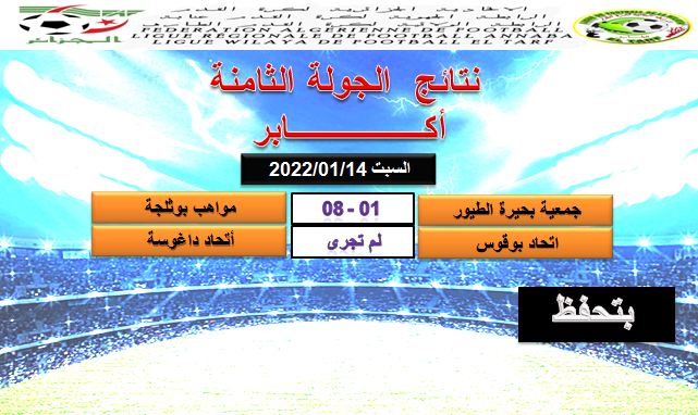 نتائج الجولة الثامنة صنف أكابر ليوم السبت 2023/01/14 ACTUALITES RESULTAT 14 janvier 2023 تحميل Share on Facebook Share Share on TwitterTweet Share on Google Plus Share Share on Pinterest Share Share on LinkedIn Share Share on Digg Share